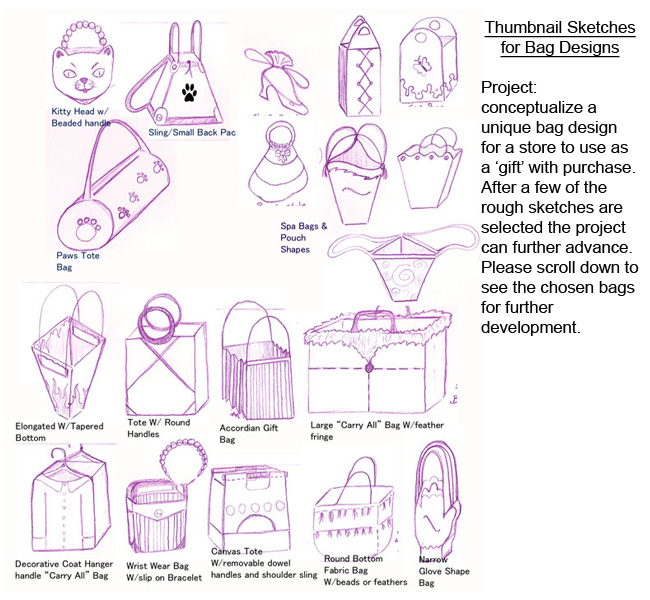 Rough drafts and thumbnail sketches showing various steps to concept design. The first example is a study of shape and color for creating dominance and submissive visual affects. The following sections begin with sketches for a unique bag design and end with the three best choices for the purpose of the project. ![]() |