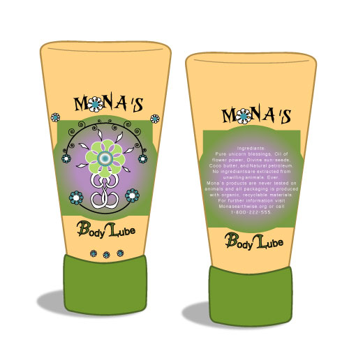 With cross platform techniques I wanted to create a whimsical design for mass production. I started with the illustration of a flower in iLLustrator and then applied some type to the design. Using the blend tool I made the back label in colors to match the front. The lotion bottle bottle was also drawn in illustrator. |